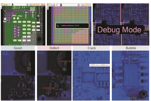 設(shè)備具備全方位的不良類型檢測能力,可準(zhǔn)確檢測出涂覆工藝中常見的多種不良問題,具體包括: