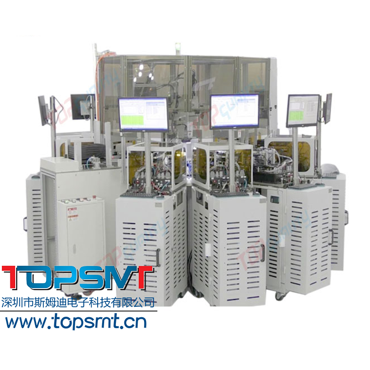 基本原理是由多組電子線路板測試臺根據需要通過傳輸皮帶組成一條電子線路板自動測試線。