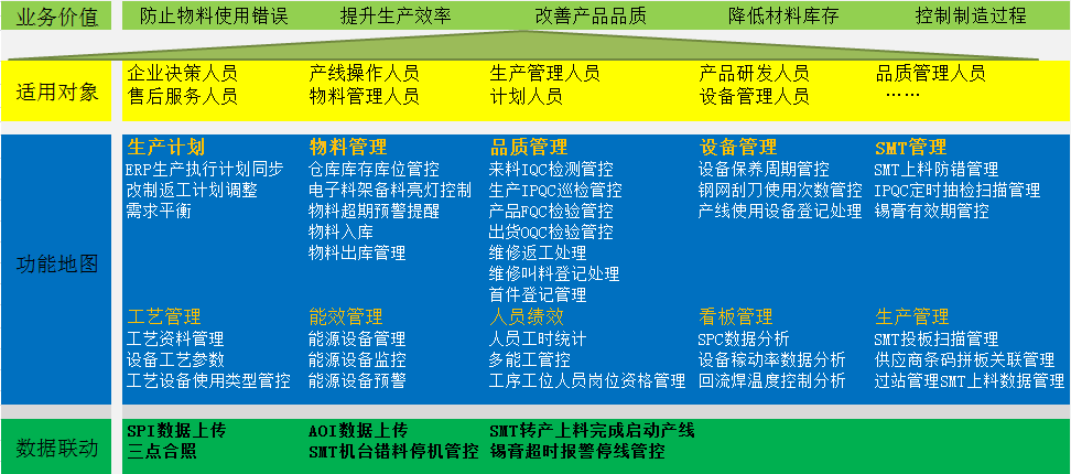 結合SMT行業當前業務特點,建立按照透明化、數字化、智能化三步走的規劃進行制造信息化建設,首先建立SMT產品條碼追溯體系,實現生產、品質數據的實時化與透明化;再進行業務優化及變革,結合精益生產、物流及設備全面管理,實現工廠信息端到端的數字化、可視化;在此基礎上再結合自動化改造及移動應用、大數據運用,實現生產自動化、工廠智能化,打造智能制造行業標桿。實現自動化與信息化互聯互通;運營大數據決策支持;